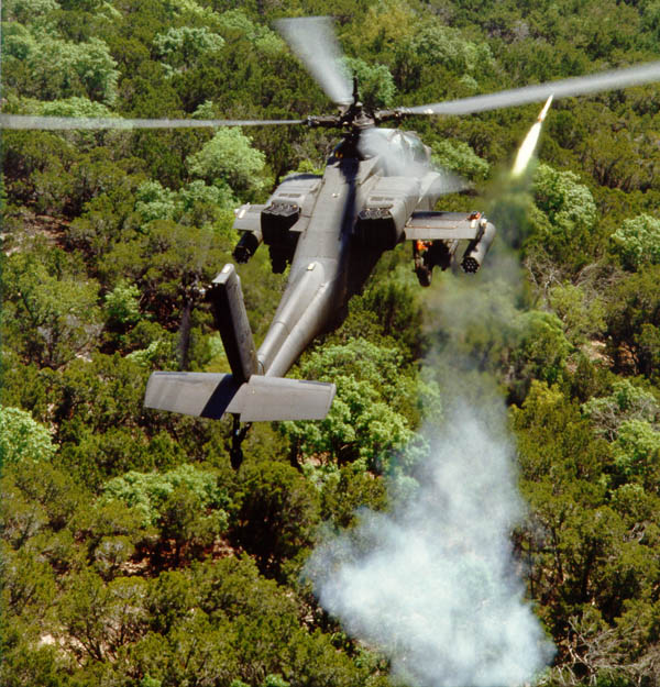 ▲ 美军AH-64A“阿帕奇”武装直升机发射火箭弹。