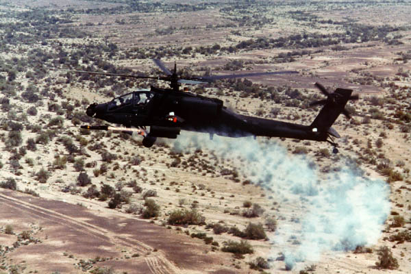 ▲ AH-64A发射“海尔法”反坦克导弹。