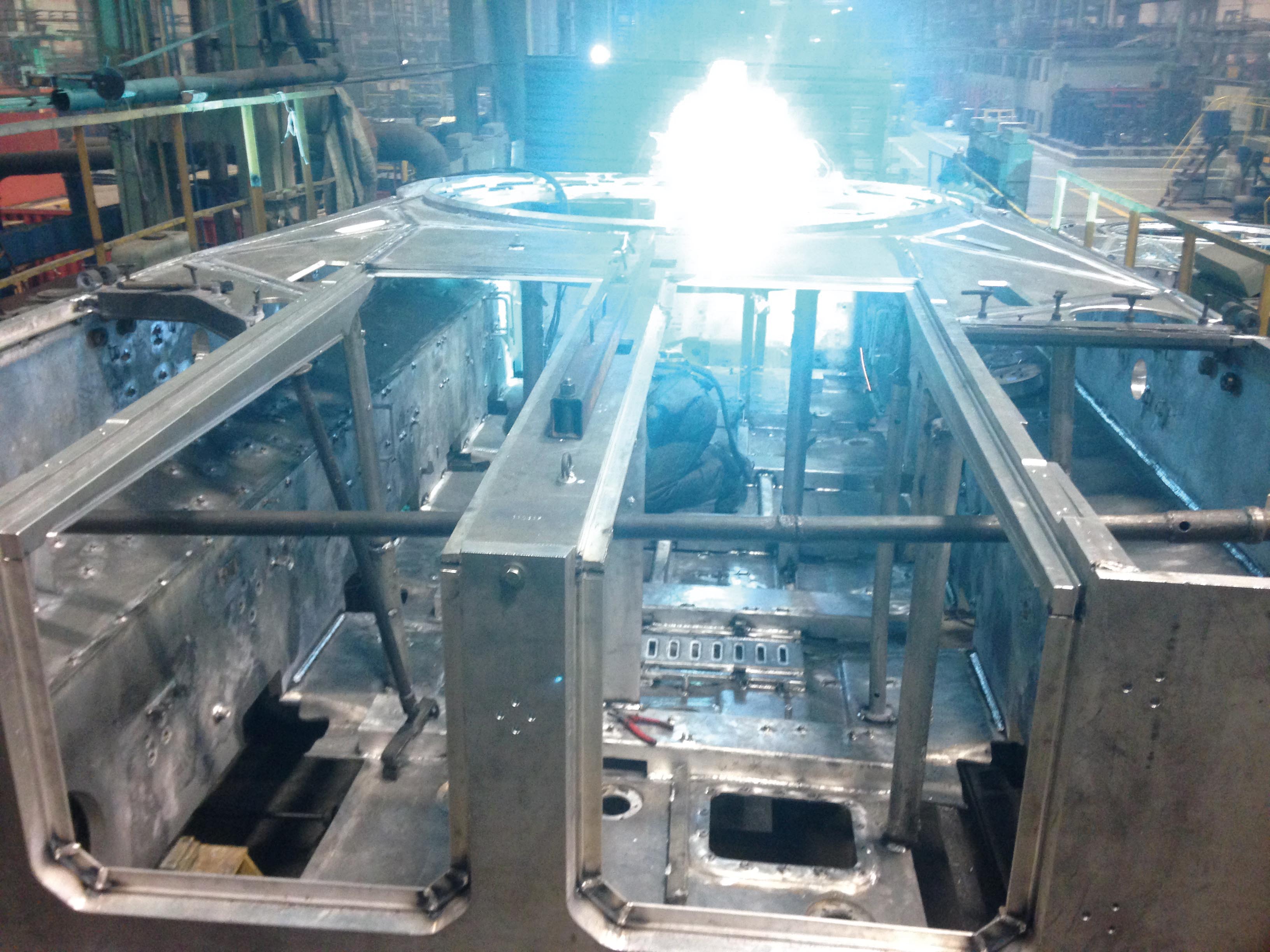 ▲ 正在进行焊接的BMP-3步兵战车车体。