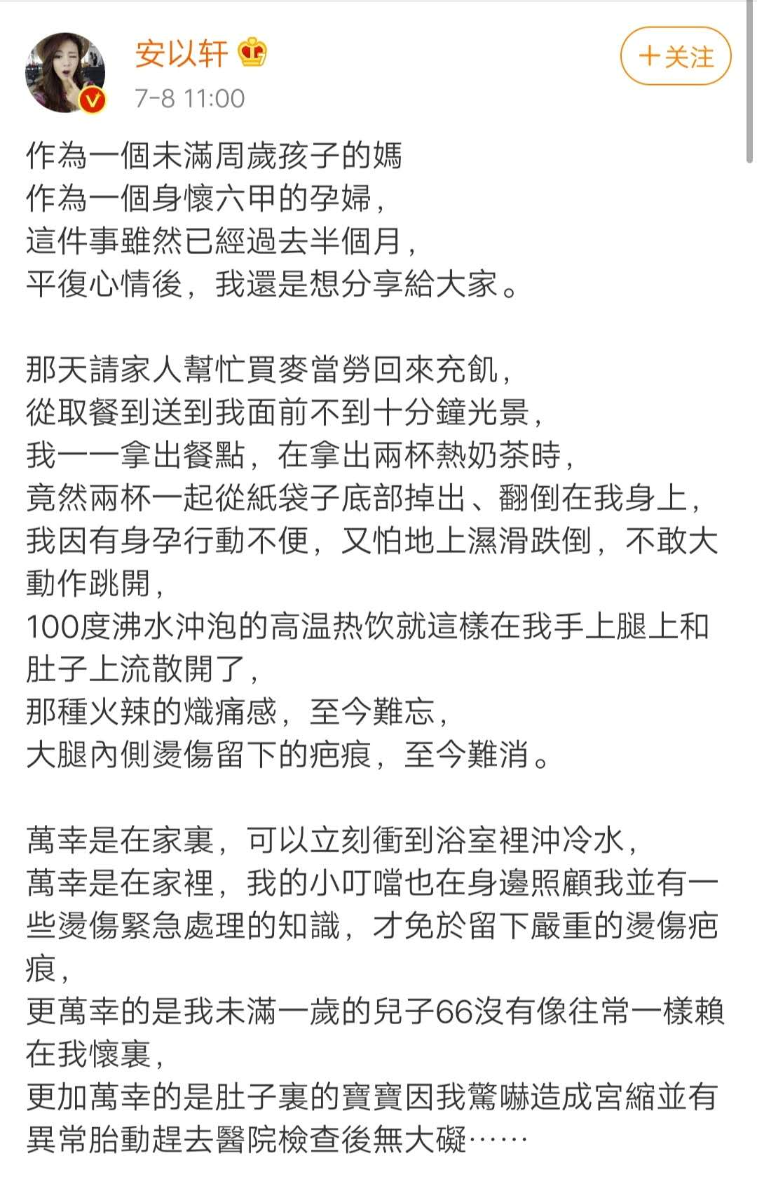 7月8日,安以轩在微博发长文称,半月之前被外卖纸袋中掉出的两杯热奶茶烫伤,导致其大腿内侧留疤,还因此受惊造成宫缩并有异常胎动,所幸经医院检查并无大碍。