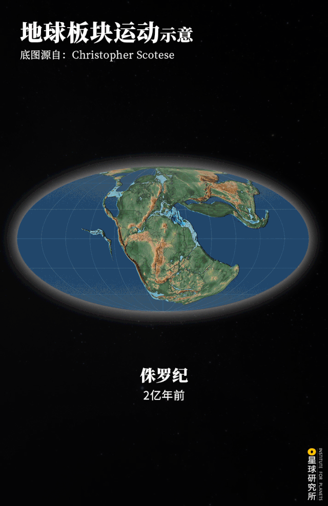 (2亿年来的地球板块运动,印度板块与欧亚板块的初始碰撞时间目前仍存争议,主要限定在6500-5500万年前;动画制作@陈随/星球研究所)