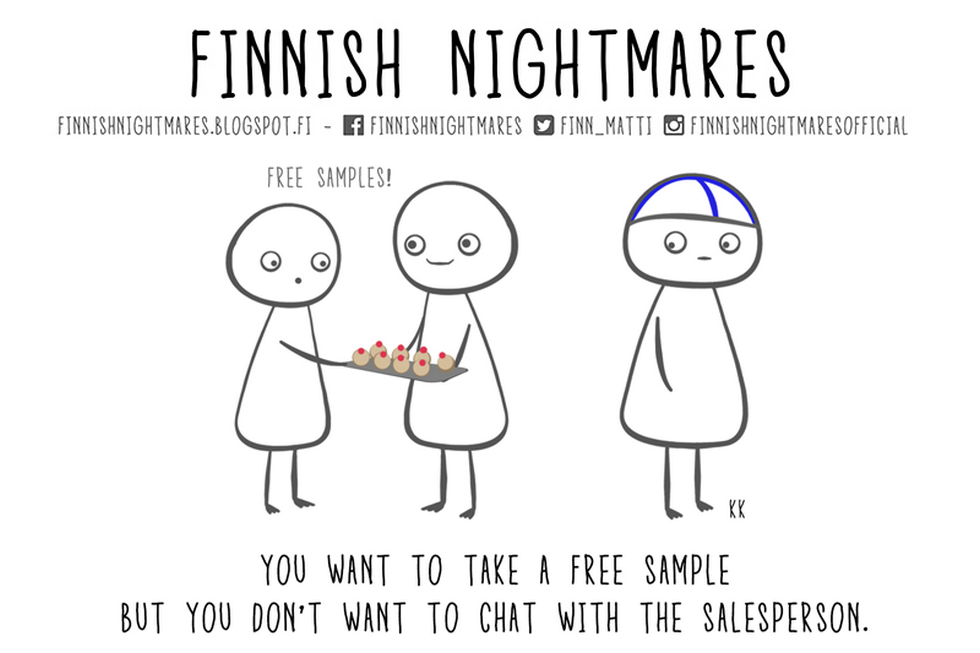 芬兰的画家Karoliina  Korhonen 更是创造出了一个带着北欧蓝帽的漫画形象Matti来从生活的方方面面给大家展示他们的社交恐惧。