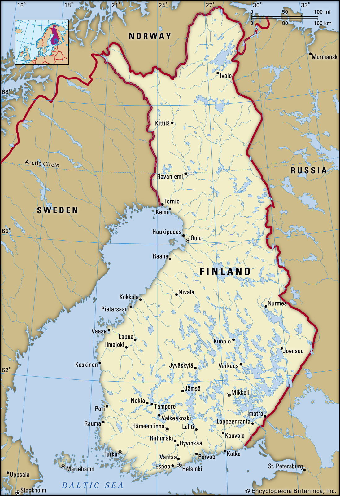 首先来看一下地理位置。芬兰位于欧洲大陆的最北端,有1/3的国土面积处在北极圈内。