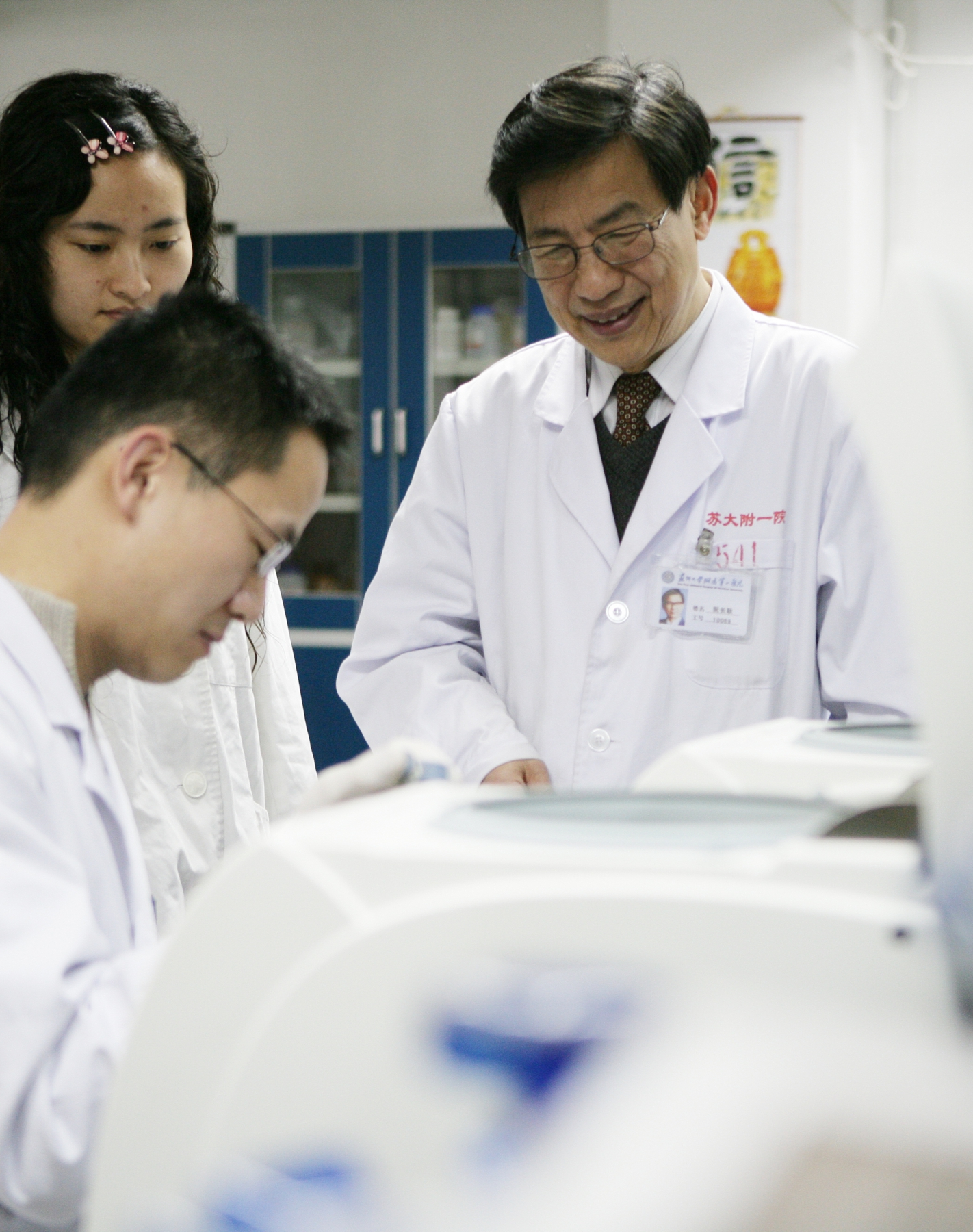 阮长耿(右一)在指导研究生做实验