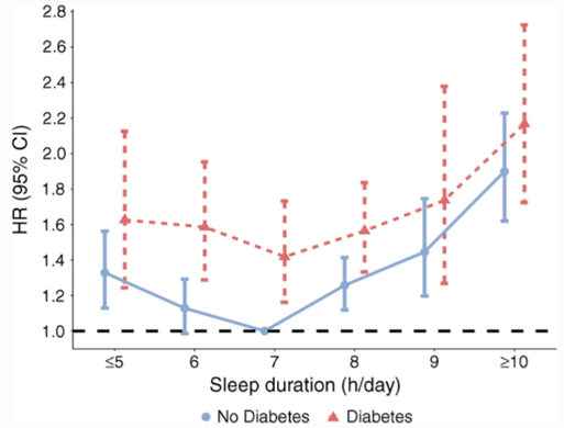 需要注意的是,睡眠时间对糖尿病患者死亡风险的影响大于对一般人群的影响。