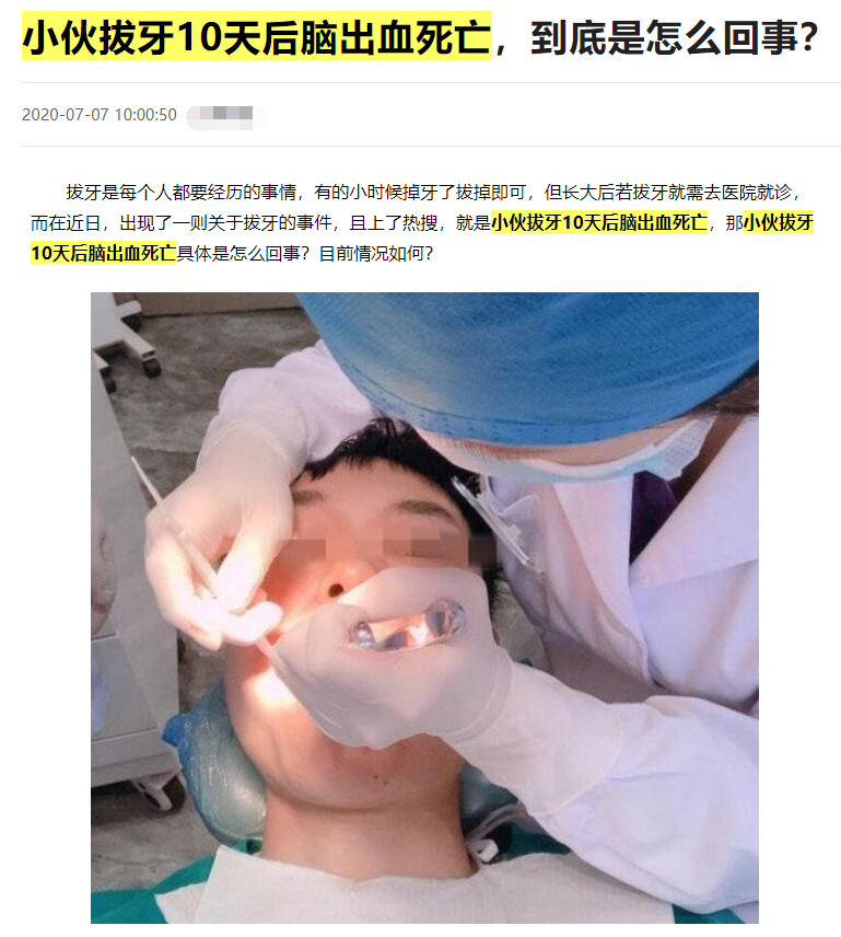 一则“小伙拔牙10天后脑出血死亡”新闻登上热搜