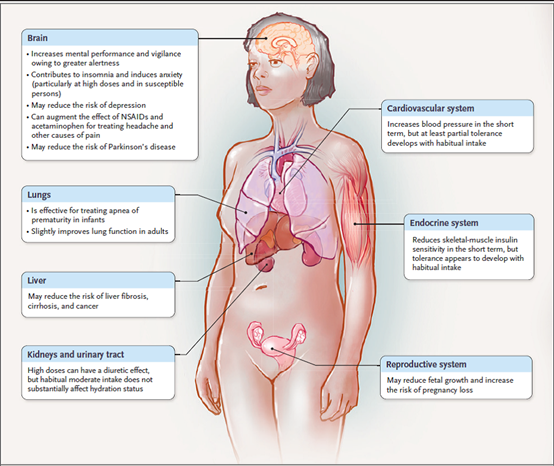 Meta分析显示,纯咖啡因可导致血压中度升高,但在关于含咖啡因咖啡的研究中,即便在高血压患者中也并未发现咖啡升高血压,可能是因为咖啡中的其他物质如绿原酸对抗了咖啡因的升压作用。随机试验显示,与喝过滤咖啡相比,每天平均喝6杯未过滤咖啡会升高0.46 mmol/L的低密度脂蛋白胆固醇,相当于心血管病发生风险增加11%。但过滤咖啡则不会升高胆固醇水平。作者认为,适量喝过滤咖啡,可能有助于控制血胆固醇水平。各类研究表明,喝咖啡与房颤无关。对于一般人群或有高血压、糖尿病、心血管病的患者来说,每天喝6杯含咖啡因的过滤咖啡也不会增加心血管病发生风险。事实上,适量喝咖啡可降低心血管病发生风险,每天喝3~5杯咖啡时风险最低。咖啡摄入量与冠心病、中风、心血管死亡风险呈负相关。代谢研究显示,咖啡因可改善能量平衡。队列研究提示,常喝咖啡可以防止长期体重增加。来自随机临床试验的有限证据表明,喝咖啡可减少体脂。但需要注意的是,含咖啡因的饮料或加糖的咖啡通常热量含量高,可能会导致增肥。咖啡因短期内会降低胰岛素敏感性,但研究显示,喝咖啡可降低肝脏胰岛素抵抗,经常喝咖啡可降低2型糖尿病风险。作者表示,咖啡因对胰岛素敏感性的不良影响可能会被咖啡中含有的非咖啡因物质对糖代谢的长期有益影响所抵消。许多前瞻性队列研究表明,喝咖啡与癌症发生或癌症死亡风险无关。相反,喝咖啡可轻度降低黑色素瘤、非黑色素瘤皮肤癌,乳腺癌、前列腺癌的风险。咖啡对子宫内膜癌、肝癌有显著预防作用。喝咖啡可降低胆囊结石和胆囊癌风险,也可降低肾结石风险。研究发现,咖啡因摄入量与帕金森病风险之间存在强烈的负相关关系。另外,喝咖啡还能降低抑郁症和自杀风险。咖啡因对胎儿健康是否有不良影响,目前尚无定论,谨慎建议妊娠期间每天咖啡因摄入量不超过200 mg。来源:Coffee, Caffeine, and Health. N Engl J Med, 2020, 383: 369-378.