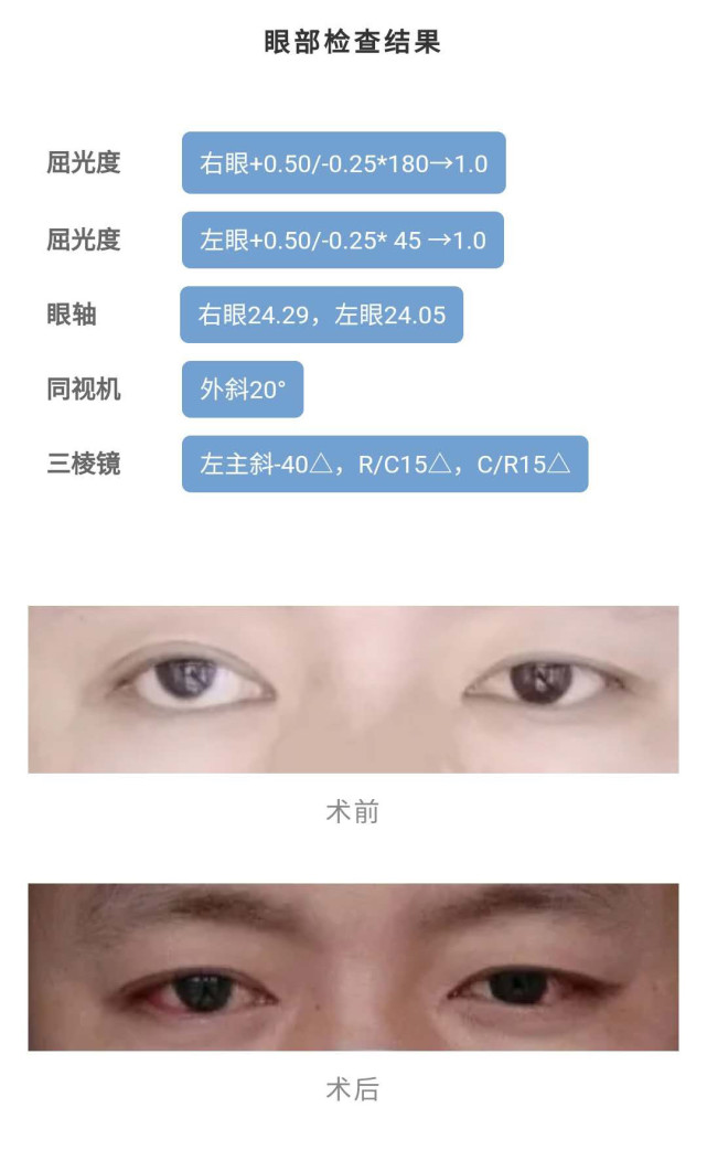 7月13日,戴鸿斌主任为黄先生实施了斜视矫正手术。原以为自己已过而立之年,对双眼恢复正常不报以太大希望,效果却超出预期:术后黄先生眼位正,眼球运动可,双眼外观与常人无异,视觉功能也在逐渐恢复,达到了斜视的一级功能治愈。