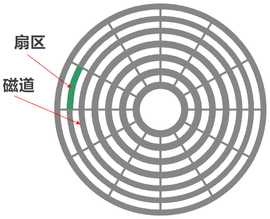 硬盘之所以叫硬盘,是因为它的核心部分是一块或多块由坚硬金属材料制成的盘片。盘片上面涂抹了磁性介质,两面都可以记录信息。在盘面上读/写数据的,是磁头。盘面中一圈圈灰色同心圆为一条条磁道。从圆心向外画直线,可以将磁道划分为若干个弧段,每个弧段被称之为一个扇区(Sector,图中绿色部分)。扇区是磁盘的最小组成单元。大家应该看出来了,越靠圆心,扇区越短。那么,是不是越往外,扇区越长,存储的数据越多呢?老式的硬盘,不管靠内还是靠外,每个扇区的大小是一样的,都是512字节。这种硬盘用柱面-磁头-扇区号(CHS,Cylinder-Head-Sector)组成的编号进行寻址。而现在主流的硬盘,扇区密度是一致的,也就是说,越靠外侧,扇区数越多。每个扇区的大小是4K字节,用一个逻辑块编号寻址(LBA,Logical Block Addressing)。以扇区为基础,一个或多个连续的扇区组成一个块,叫做物理块。所以,硬盘往往又叫块设备(Block Device)。