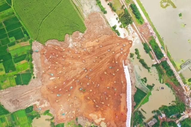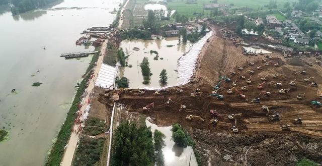 用火神山雷神山的精神抢修围堤 | 7月27日,安徽阜阳市颍上县姜唐湖蓄洪区戴家湖堤段,由涵闸破损引起直径约10米的强烈管涌。指挥部特事特办,调集200多台挖掘机和推土机,挖田取土,用60个小时修建起大型围堤(图中覆盖白色防水布的新堤),化解险情。图源@人民视觉