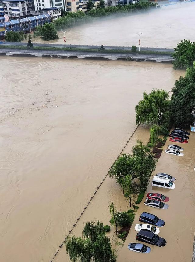 湖北恩施清江发生短暂漫堤 | 受暴雨和上游水库紧急泄洪影响,清江水位暴涨,7月17日下午一度漫过河堤,淹进了清江水岸社区,许多汽车被淹。图源@人民视觉
