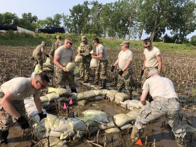 美军士兵在密苏里河的大堤背后排除管涌 | 世界多国都投入军队进行抗洪救灾工作,而构建反滤围堰的方法也是全球通用。图源@美国国防部,Dvidshub.net,公共领域