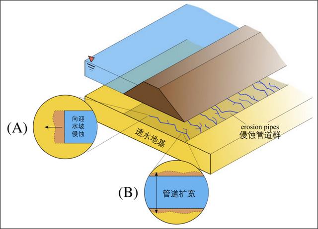 堤防中典型的两种渗流破坏 | 发生在堤身的渗水/漏水洞,和发生在地基的管涌,是河堤的两大类渗流险情,十分危险。底图@文献[10]