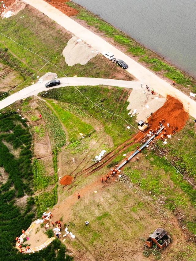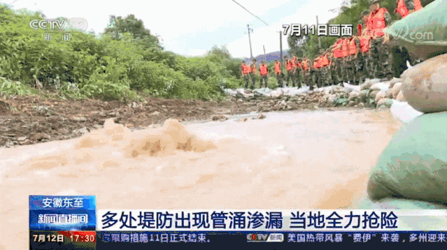 堤防背水面发生滑坡险情 | 7月17日,安徽安庆怀宁县凉亭乡三鸦寺湖堤背水侧发生滑坡,官兵们紧急处置,避免了溃决。图源@人民视觉