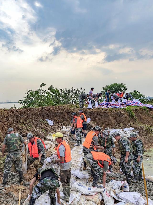 空军官兵抢筑子堤 | 7月13日中午,在江西九江的江洲镇,空军官兵抢修子堤,抵御漫堤。江州镇位于长江的一个江心岛上,今年汛期呼吁在外游子回乡抗洪,一度名声大噪。图源@人民视觉