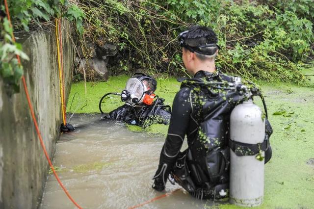 潜水员探寻漏水洞的洞口 | 横穿大堤的涵闸、管线、建筑与泥土的接触部位,容易发生浑水渗流。图为潜水员寻找一处涵闸接触漏水的进水口。图源@人民视觉