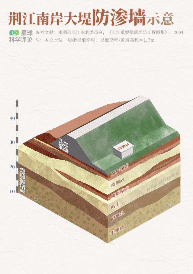 荆江南岸大堤防渗墙示意图 | 防渗墙可以深入地下,在大堤填土和地下透水层中减缓渗水速率。它的作用并非杜绝渗水和管涌险情,而是将它们出现的时间推迟。如果等到洪水退去也不产生险情,大堤就安全了。制图@王申雯/星球科学评论