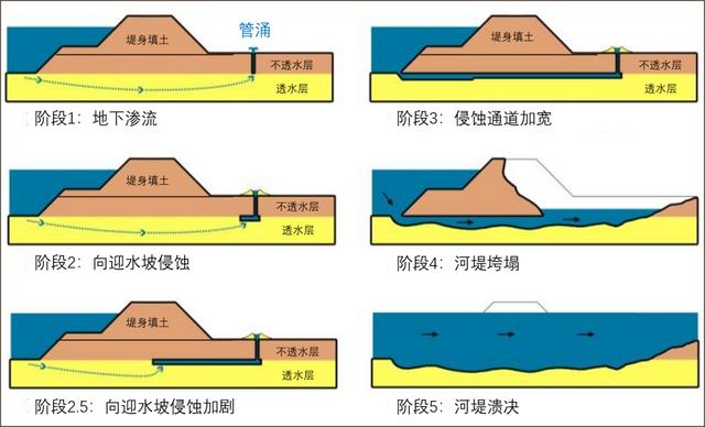 管涌破坏堤防的过程示意图 | 管涌时,大量地下泥沙随浑水流出,进而掏空地下,造成大堤失稳垮塌,引起决堤。透水层一般指砂层,而不透水层指泥层或粘土层。底图@文献[13]