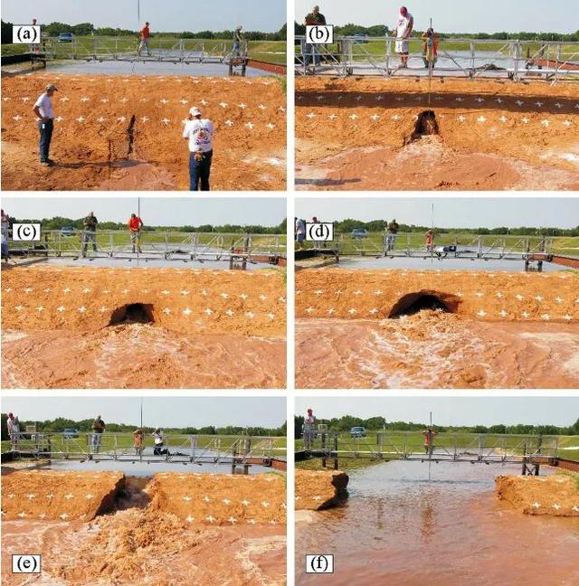 漏水洞引起决堤的实验 | 在这个实验里,由于河堤的规模很小,从a到e只用了13分钟。在实际河堤里时间会长一些,但仍属于“较短时间”的范畴。图源@文献[3]