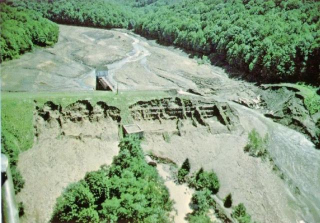 洪水漫溢引起的决口和冲刷 | 漫溢对土质水坝下游一侧造成了强烈冲刷,最终引起决口。该事件发生于1977的美国宾夕法尼亚州。图源@文献[38]