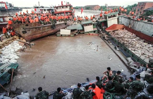 1998年九江决堤后的沉船堵口现场 | 除了因偷工减料被痛骂做豆腐渣工程外,九江大堤决口的主要原因是管涌控制失败。在堵口现场,人们一共凿沉了8条满载砂石的驳船来减缓水势。图源@视觉中国