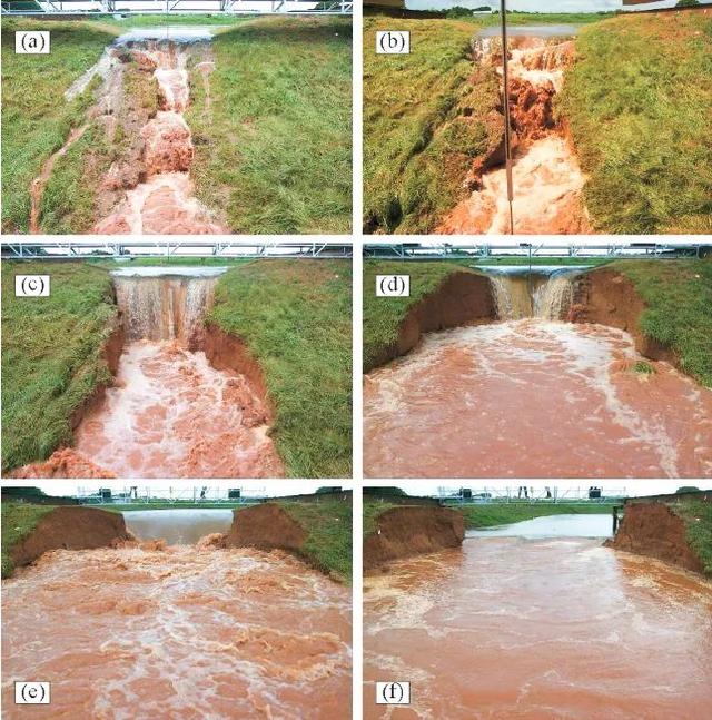 从漫堤到决堤的过程 | 漫堤以后,水流首先冲出陡坎和小坑,随后连接扩大成冲沟,发生溯源侵蚀,向后切开大堤,最终决口。图源@文献[3]