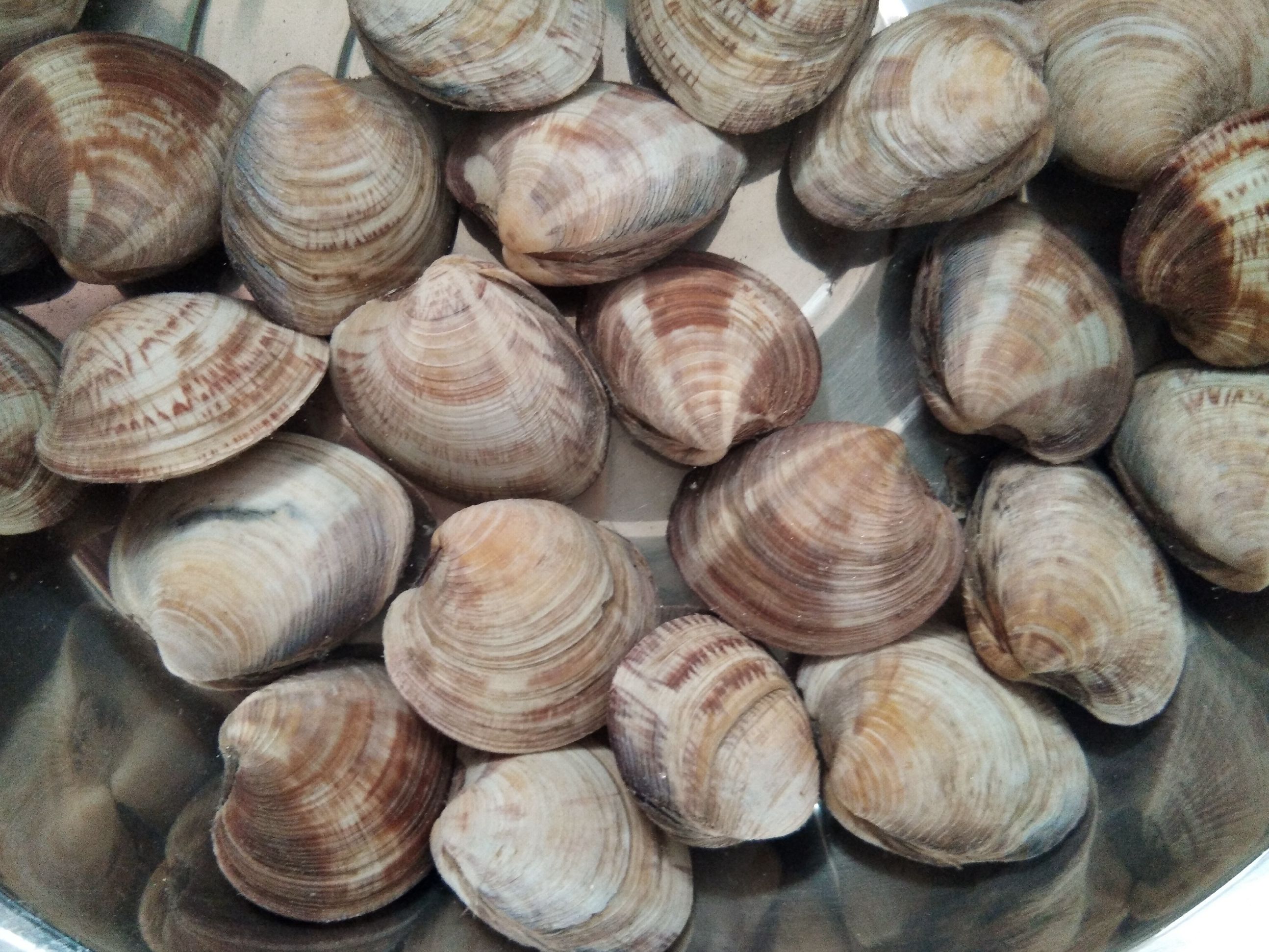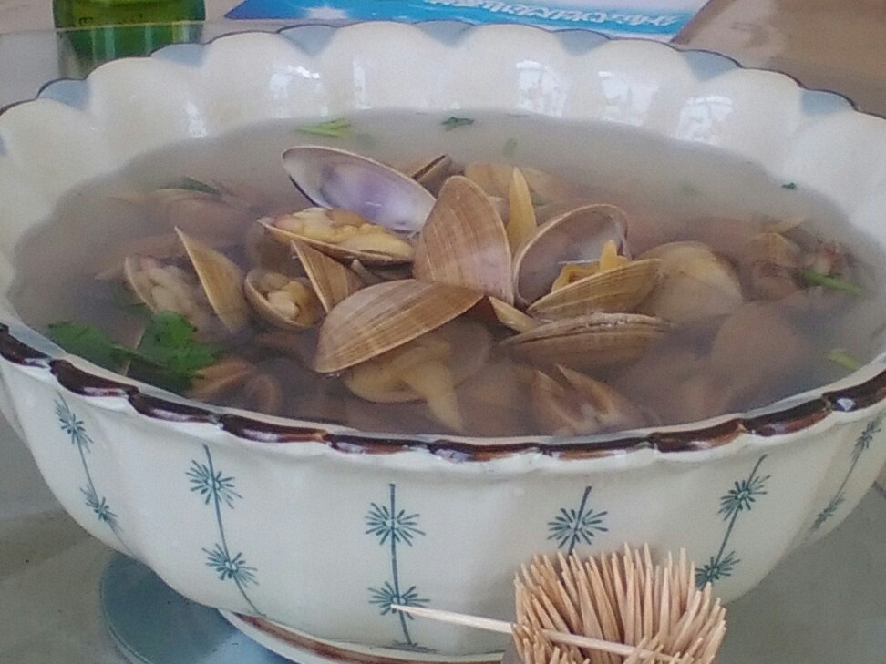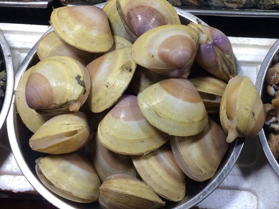 7、中国蛤蜊/Mactra chinensis,也叫中华马珂蛤,青岛“沙嘎啦”,东北“黄蚬子”。壳呈较圆的三角形,红褐色或黄褐色,生长纹明显,无花纹。肉质较菲律宾蛤仔硬一些,鲜味儿似在其之上。产于黄海北部,青岛并不常见,郊区略多,据说东北大连丹东一带更为流行。