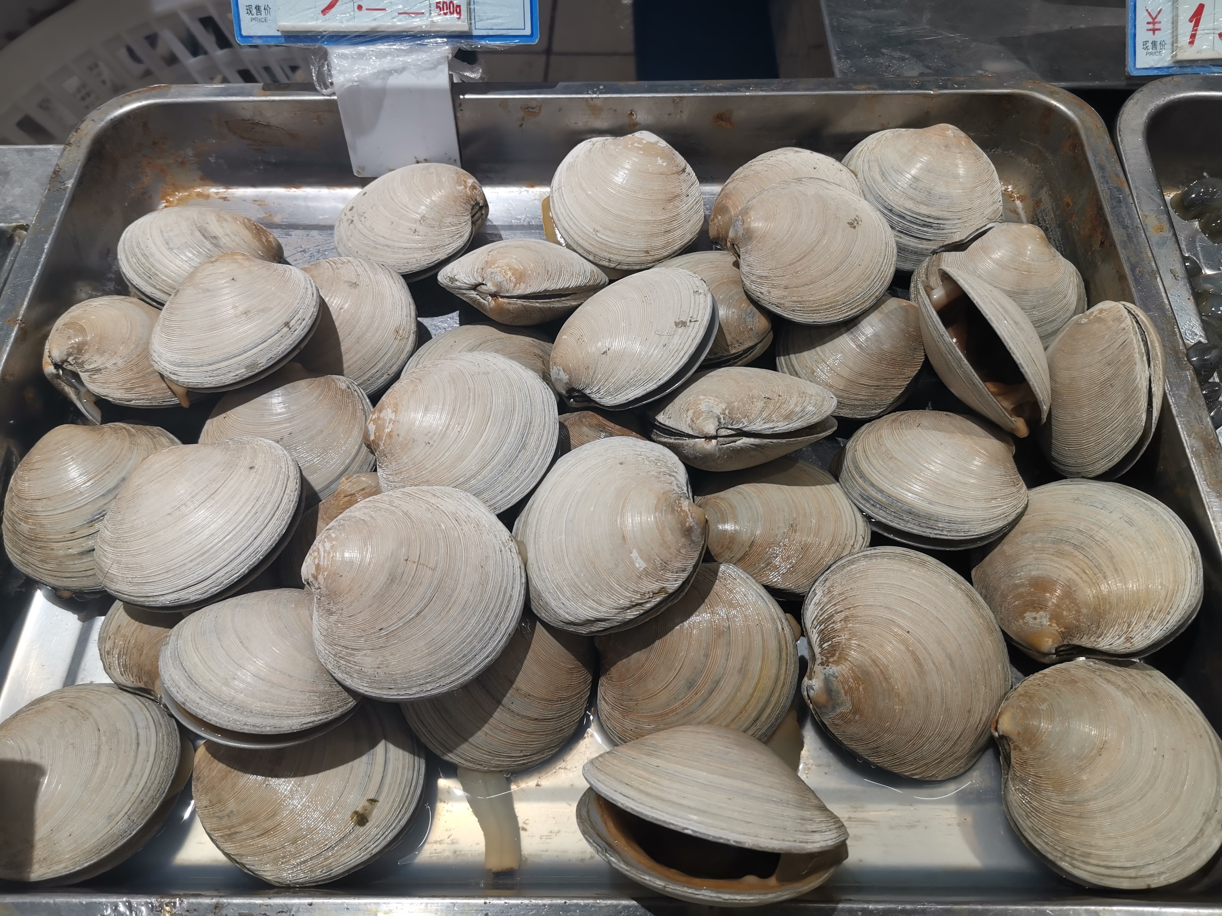 3、硬壳蛤/Mercenaria mercenaria,硬壳蛤属,又名薪蛤、美洲帘蛤。原产北美大西洋西岸,97年引入国内养殖。外形略似文蛤,壳质坚厚,表面较平滑,生长纹明显而细密,有黄色或黄褐色斑块,但与文蛤的“浓墨重彩”风格不同。肉厚味美,据说深受西夷喜爱,是北美市场最受欢迎的贝类之一。