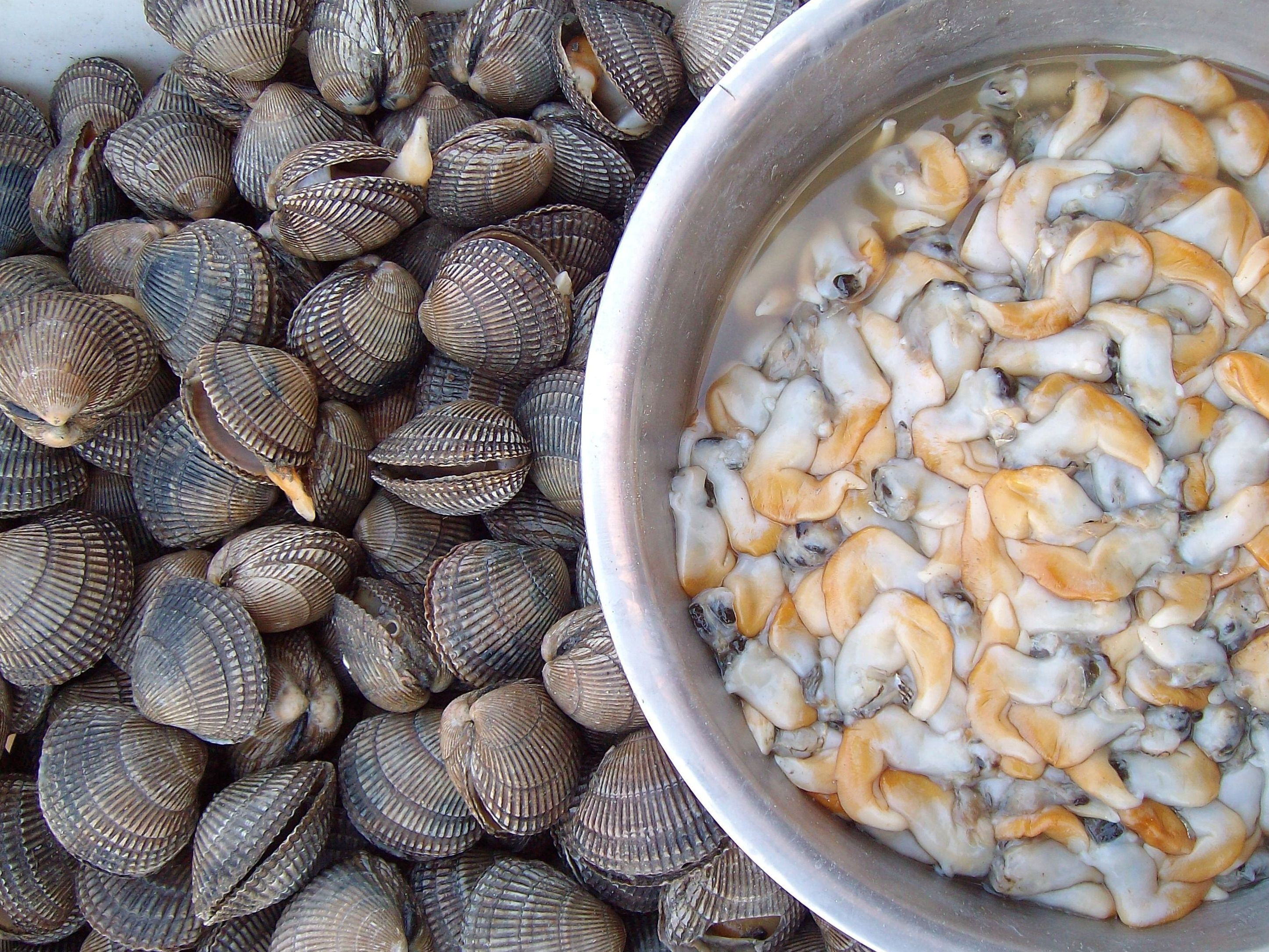 10、加州扁鸟蛤/Keenocardium californiense,俗称鸟贝或黄鸟贝。壳表暗褐色,放射肋38条,有很明显的呈年轮状的生长线。出售时一般只取斧足,宜白灼、凉拌。软塌塌的时候尚且看不出鸟的姿态,熟后就支棱起来了,神似展翅欲飞的鸟。烟威多、青岛少,我只在谪守即墨农村时吃过。