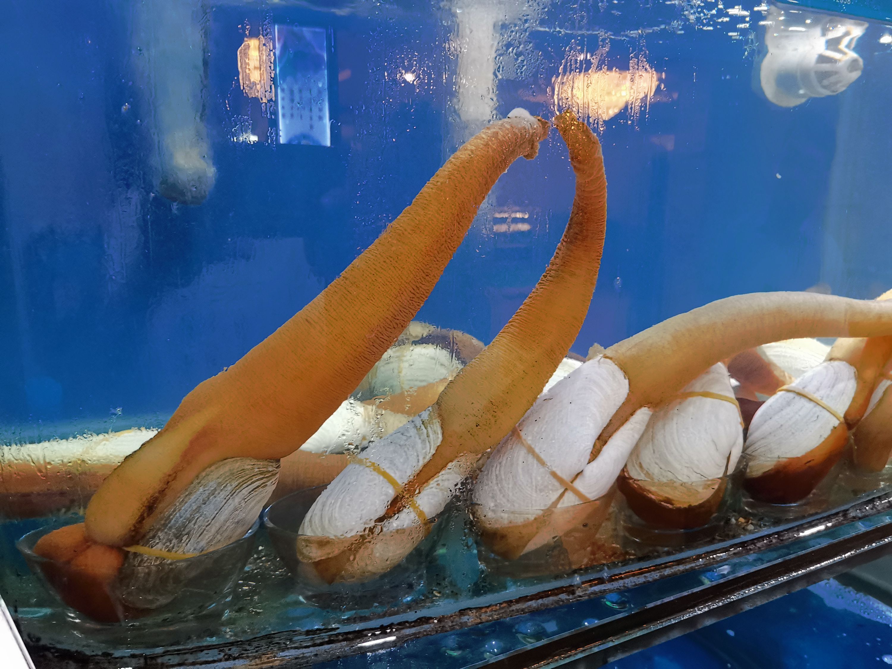 22、太平洋潜泥蛤/Panopea abrupta,重量级海鲜大咖,水管极发达犹如象鼻,故俗名“象拔蚌”。又叫“高雅女神蛤”,但正如你所看到的,它的形象既不高雅,也绝不像女神。本种出肉率高,达60%-70%左右,主要食用部位为水管肌,脆嫩鲜甜,可直接切片生食。原产北美,国内有养殖。