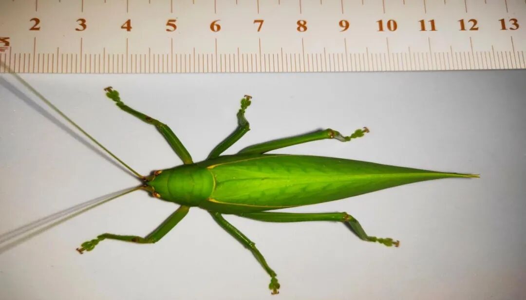 ●近日,记者从四川成都华希昆虫博物馆获悉,该博物馆馆长赵力日前在青城山发现了一只体长8cm的巨型螽(音“中”)斯,这比四川过去常见的螽斯大一倍,刷新四川最大螽斯记录。(来源:科技日报)