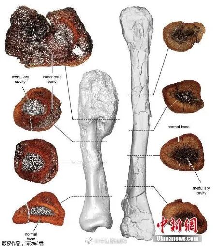 ●当地时间8月3日,科学家首次在一种生存于7600至7700万年前的有角恐龙的化石中发现和诊断了骨肉瘤。化石最初在1989年发现,化石的畸形端头当时被认为是愈合性骨折。图为患有恶性肿瘤的恐龙化石骨(左)与恐龙的正常胫骨的对比图。(来源:中国新闻网)