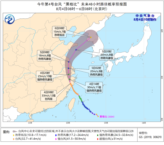 ●4日,今年第4号台风“黑格比”上午9点钟其中心位于浙江省台州市境内,中心附近最大风力有11级(30米/秒),预计“黑格比”将于5日上午从江苏中部移入黄海,尔后转向东北方向移动,向朝鲜半岛西部沿海靠近,逐渐减弱变性。(来源:中央气象台)