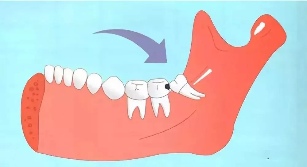 智齿萌发空间不足,常常会倒在第二磨牙上,因而造成第二磨牙不易清洁,造成龋坏。智齿躺的时间一长,就会把旁边的邻牙都顶坏了,然后两颗都同归于尽。