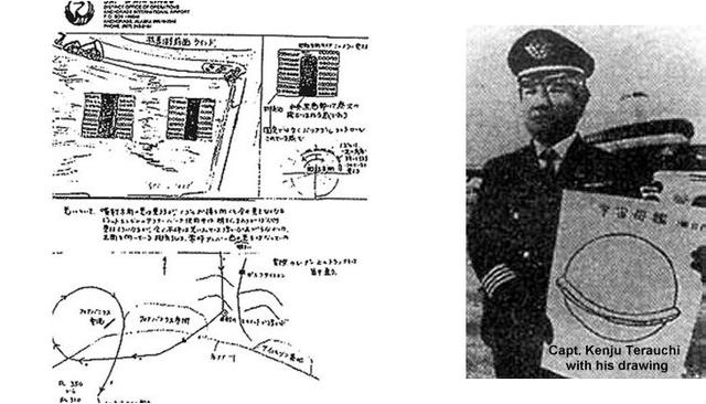 寺内机长报告称当时飞机飞行速度0.84马赫,高度11000米:“ 它们平行飞行,然后突然接近 ……”,他描述那个最大的不明飞行物轮廓类似胡桃,它的大小“大约是航空母的两倍”。
