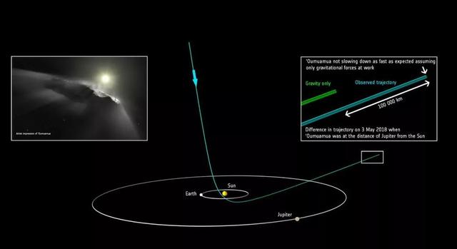 其最典型的是2017被发现的来自于太阳系外的奥陌陌小行星,它在经过近日点后,欧洲天文台科学家发现它出现了神秘加速现象,实际轨迹位置超过预测轨迹十万千米,一时间奥陌陌是一艘飞船的说法不胫而走,但其实这只是奥陌陌朝着太阳方向的挥发物质被加热喷出,出现了一个反向动力效应,导致奥陌陌速度越来越快!