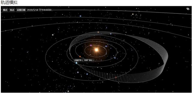 编号为136795(1997 BQ)的小行星每隔844天(2.31年)围绕太阳公转一周,近日点0.91AU,远日点2.58AU,它的直径根据其亮度变化分析,可能是一个长条形,长度可能在1.5千米左右,看起来似乎并不大,但它已经超过97%的小行星!1997 BQ每次经过近地点时的距离是变化的,NASA预测了未来约200年内最接近地球的几次轨迹!