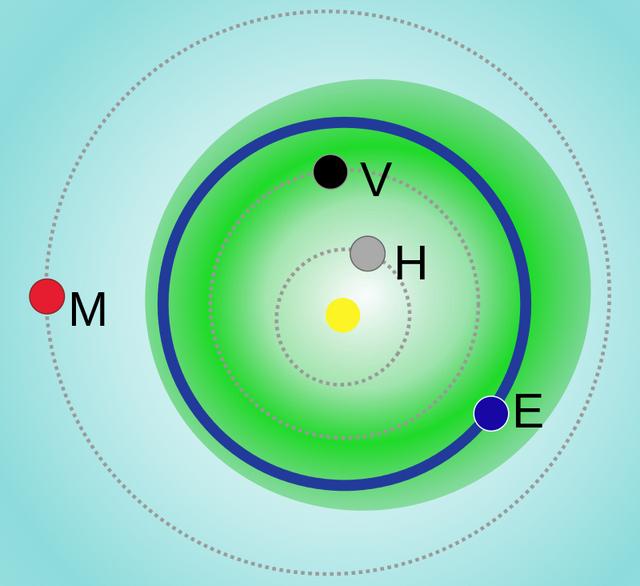 阿波罗型小行星(以绿色显示)。 中心往外依序是太阳(黄色)、水星(灰色)、金星(黑色)、地球(蓝色)
