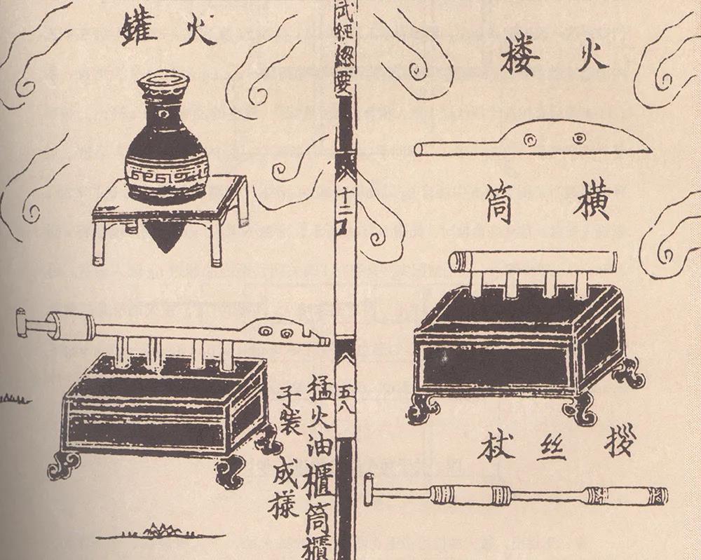 据《武经总要》记载,猛火油柜“以熟铜为枦,下施四足,上列四卷筒,卵筒上横施一巨筒,皆与柜中相通,油自火楼中出,皆成烈焰,中人皆糜烂,水不能灭也。”