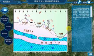 (2)实验功能及效果:该实验可以作为将现实课堂中无法具体描述清楚的流域汇水过程情景以生动形象的操作形式展示出来,让原本无法近景体验和观察的流域汇水逼真的展示在虚拟实验环境中,学生观察不同位置的流域汇水过程,按照实验操作提示选择操作,互动过程中进行实验操作,通过开展该实验,让学生熟悉流域汇水过程,掌握流域汇水过程相关水文计算。