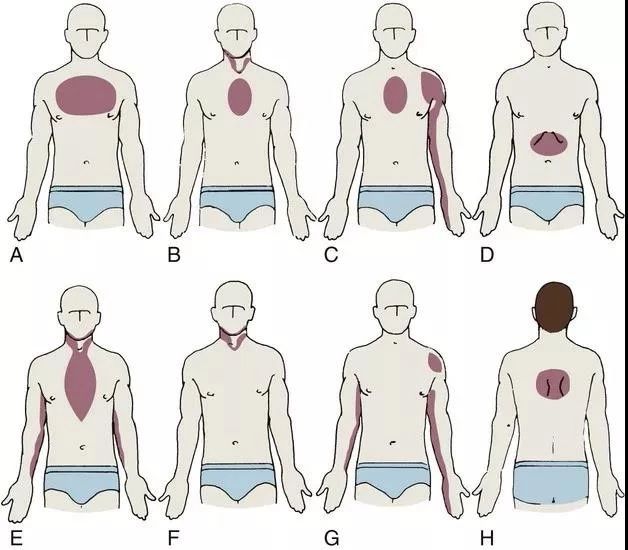 猝死前或心梗的症状常被忽视。杨进刚说,这其中最重要的症状是比较严重的胸痛或胸闷,伴有大汗。胸痛的部位可能是前胸、后背、下颌、胸骨后、上腹部、剑突下、后背等部位(如上图阴影部分所示),可以是持续性,也可能是间断性,性质可以是压榨性、烧灼样、憋闷,有时难以忍受,有濒死感或恐惧感。如果伴有面色大汗、苍白、乏力、恶心、呕吐等症状,更有可能是心梗或猝死前兆。