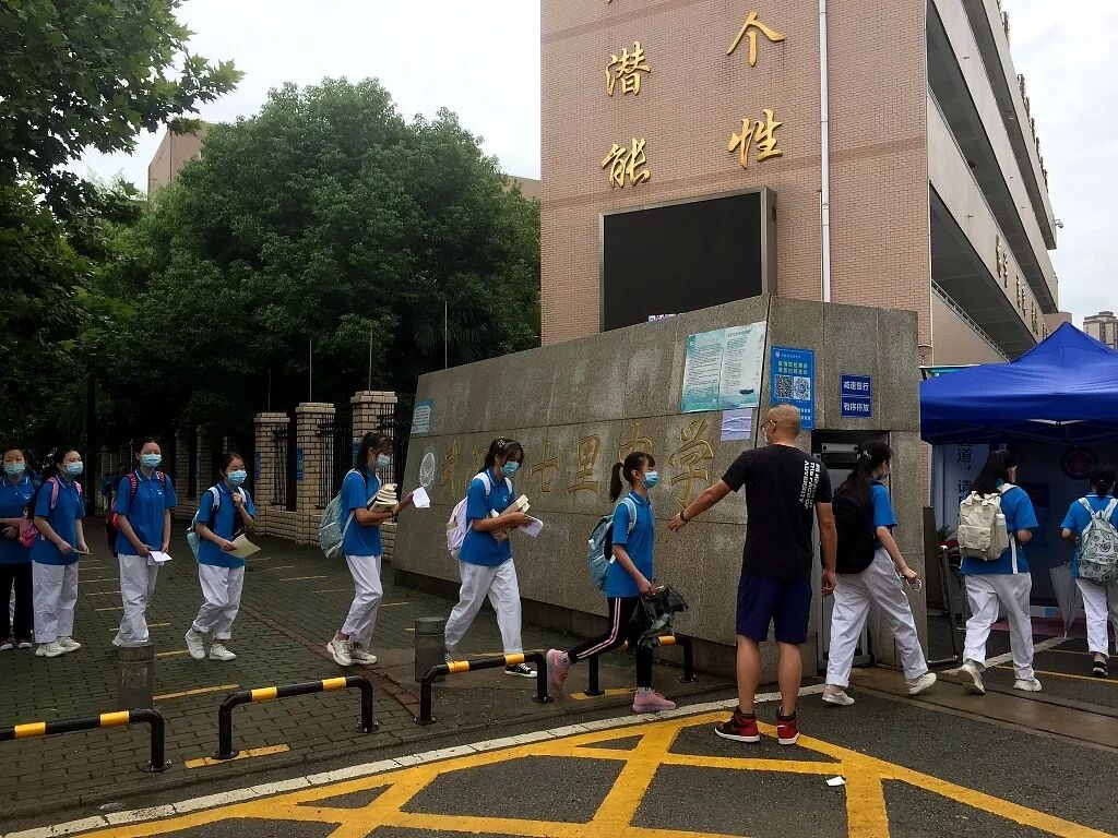 8月10日早晨,湖北省武汉市七里中学,初一、初二年级学生在学校门口排队接受体温检测后进入学校。