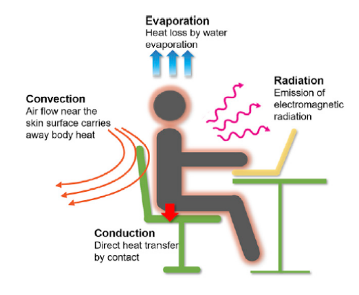 首先,我们要知道,人体内的新陈代谢会产生热量,人体需要将多余的热量散发到周围环境中,才能保持体内的稳态。通常有四种不同的散热途径来调节人体的体温:辐射,传导,对流和蒸发。这四种方式的共同作用,使我们拥有了稳定的体温。但是不同的情况下,它们所发挥的作用大小也有所不同。例如,当人们安静地处于室内时,中红外波长范围的辐射是人体热量散失的主要途径;而在激烈的运动中,身体会通过汗液的蒸发来排出大部分热量。