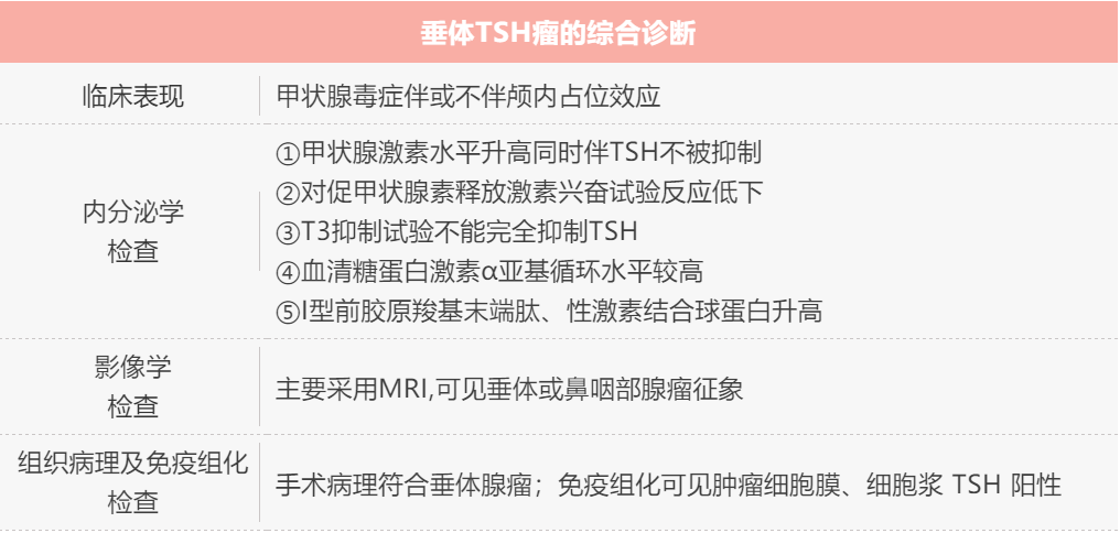 垂体TSH瘤引起的中枢性甲亢虽然在临床上少见,但是其治疗与其他原因引起的甲亢完全不同,注意其实验室检查的特点,可以早期发现,早期诊断并合理治疗。故甲亢患者血清 TSH 不被抑制时要警惕有无垂体 TSH瘤的可能,需及时行垂体磁共振检查,若发现垂体瘤应尽早手术治疗。
