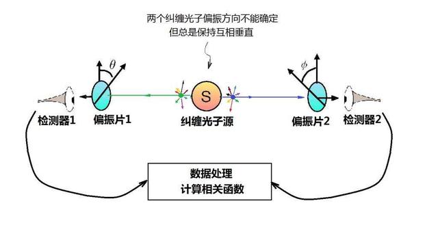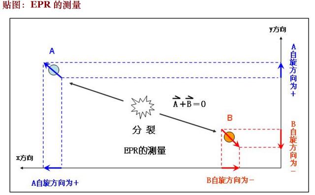 一个不稳定的大粒子衰变成两颗小粒子A和B,这两颗粒子会有两种可能的自旋方式,假设它是左旋,那么另一颗粒子必定是右旋,但量子力学认为,在我们没有观察它之间,它们的状态就是不确定的,只能用一个波函数来描述它们!
