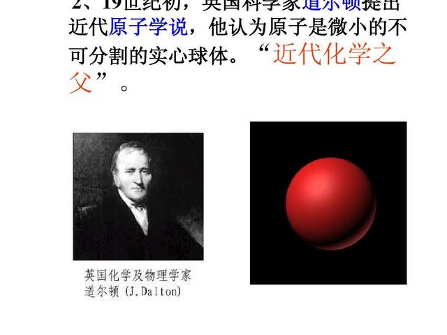 1803年英国科学家提出现代原子论(古希腊时代那个拍脑袋的原子论我们就不说了),他认为原子是均由很小的原子组成,不同的单质由不同质量的原子构成,不过由于时代局限,道尔顿认为原子是一个坚固的实心小球。
