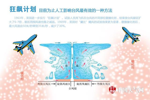 值得一提的是人工削弱台风,因为台风对全球中低纬度地区影响极大,夏季的灾害性气候至少有一半以上都是台风!从1947年开始,美国就尝试影响台风,方法是播撒碘化银在台风的气旋内,消耗台风的能量,达到减弱台风的目的,到60-70年代为止,在历次台风削弱实验中,使最大风速降低了10%-30%,但台风能量补充过程极其复杂,最大风速降低并不一定是人工影响的结果,所以到现在为止这个结果是否是积极影响也未能确认。