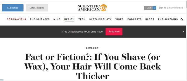 顺便说个剃毛的问题,据2014年8月26日的《科学美国人》发表了一篇名为《Fact or Fiction?: If You Shave (or Wax), Your Hair Will Come Back Thicker》的文章,研究表明刮腿毛不会引起腿毛变粗变多的现象,有些人有这个错觉是因为在毛发自然生长过程中的硬度不一样,或者是随着年龄增长本身就有一个自然增长的趋势。