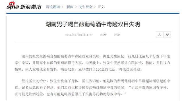 最后就是酿制过程中的工艺与温控和最后的食品安全检测,因为自酿的设备与工艺以及温控上的不足,无法排除发酵过程中的杂质,比如葡萄皮中的果胶在果胶酶或热能的作用下会分解出甲醇,葡萄中的蛋白质水解为氨基酸,再经过酶的催化作用生成杂醇油。甲醇即使工业酒精,这个危害轻者不适,重则失明甚至丧命都有可能,杂醇油的毒副作用和麻醉作用比酒精强,会让神经系统充血,使人头痛!