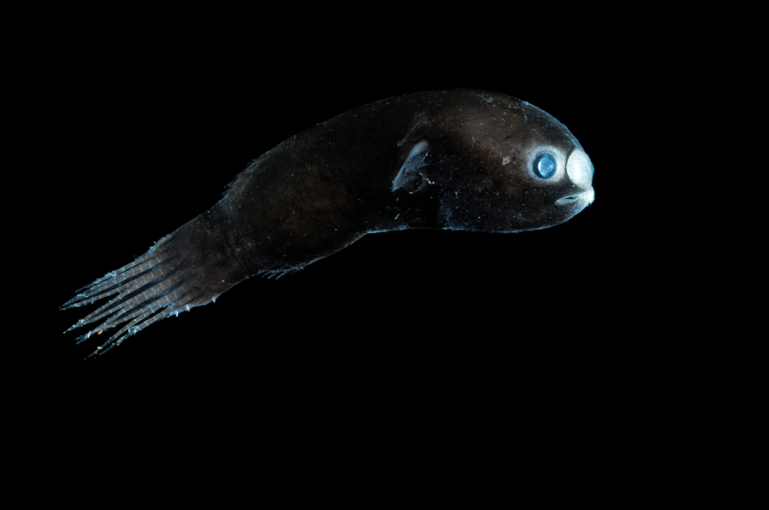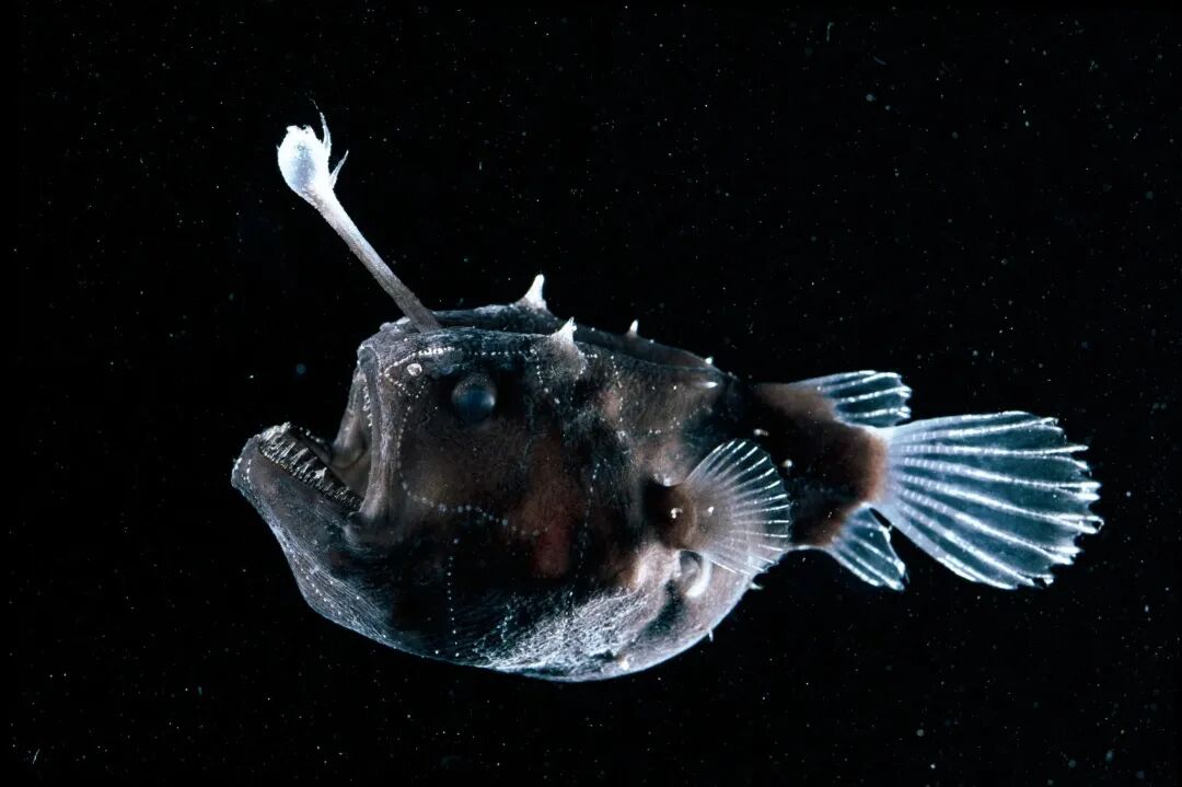 一条小小的雄性鮟鱇向不远处的一条雌性鮟鱇游了过来,之所以用“小小的”来形容它,是因为这种鮟鱇鱼雌性的体型要远大于雄性。